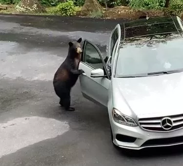One curious bear was attempting to search a car in hopes of some food giving the car owners quite a shock. Luckily one of them took initiative and screamed like a banshee to repel the creature.