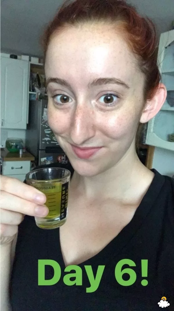 Day One: Starting is more complicated than expected. It takes her more than 10 minutes just to raise the first shot of pickle juice up to her mouth. Ultimately it isn’t too bad although the flavour is a little strong in the mouth.